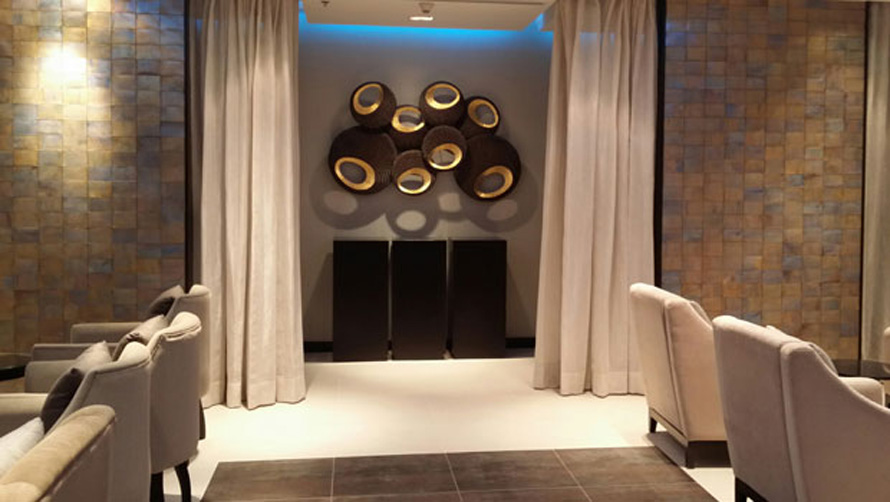 The interior design features a natural colour scheme, enhanced by soft lighting which also reflects the Oman Air corporate colours. Traditional Omani artefacts are showcased in bespoke cabinets hung from the walls, and contemporary sculptures provide an additional focus for the eye.